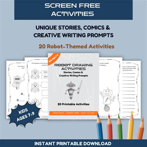 Robot Drawing Activities For Kids | 20 Printable Story & Writing Prompts | Screen Free Activity Sheets | Instant Download Ages 7-9